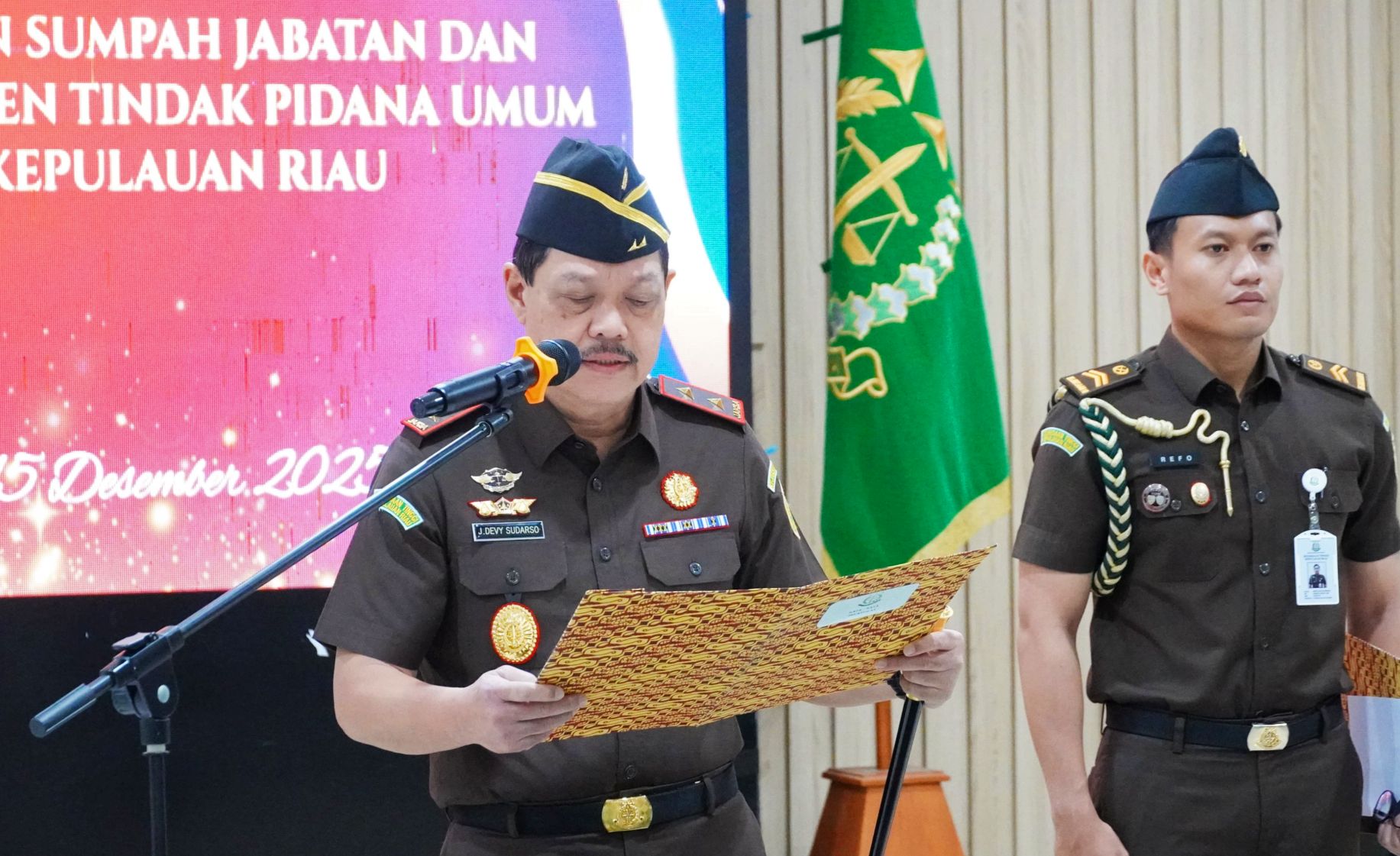 Kepala Kejaksaan Tinggi (Kajati) Kepulauan Riau (Kepri), J. Devy Sudarso memimpin Upacara Pelantikan, Pengambilan Sumpah Jabatan dan Serahterima Asisten Tindak Pidana Umum Kejati Kepri dari Pejabat lama Bayu Pramesti, S.H., M.H kepada pejabat baru Toto Roedianto, S.Sos., S.H. Kegiatan itu berlangsung di Aula R. Soeprapto Kejaksaan Negeri Batam, Senin (15/12/2025).