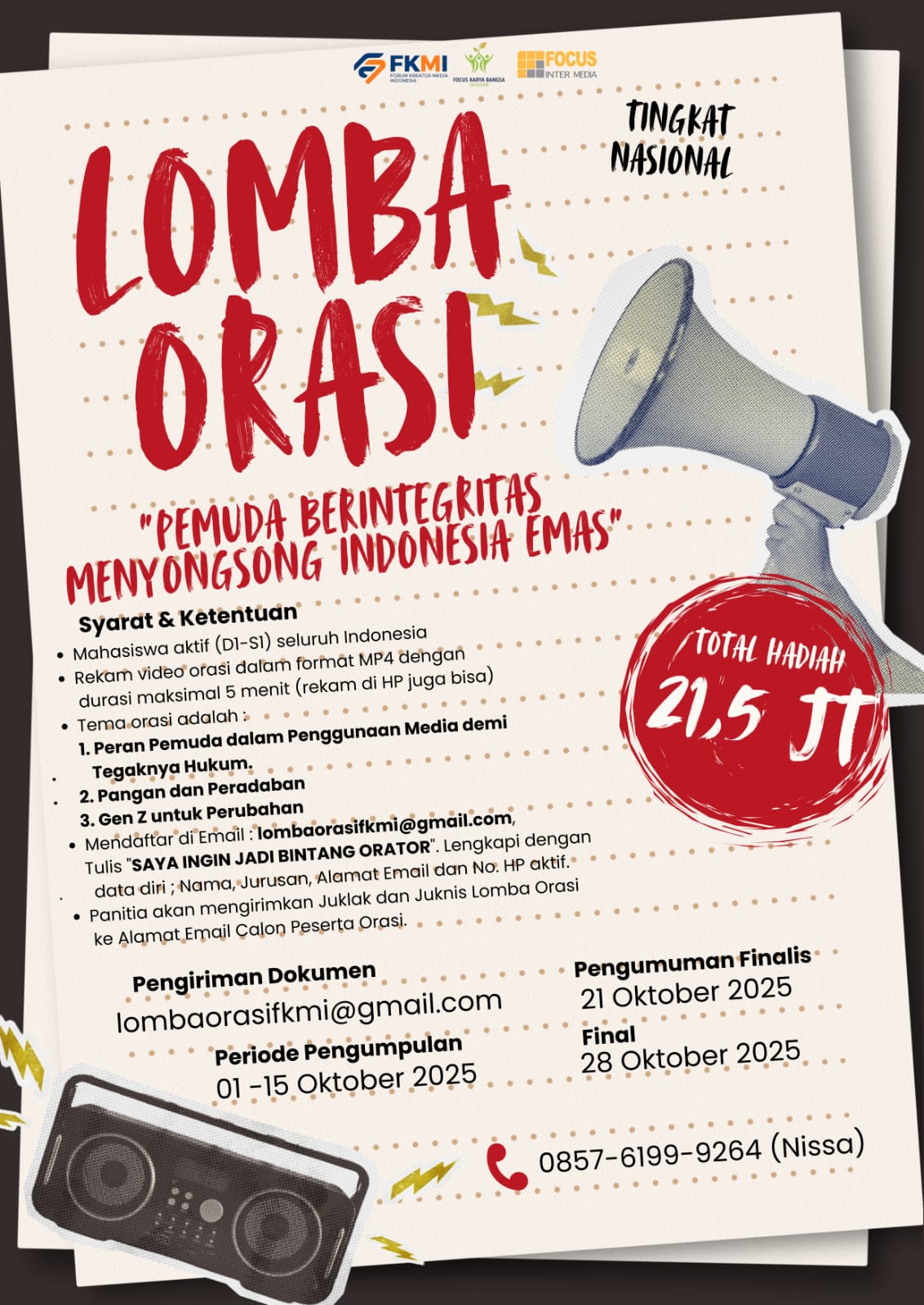 Jangan lewatkan kesempatan untuk berpartisipasi dalam orasi nasional ini dan memberikan kontribusi nyata bagi Indonesia! Segera daftarkan diri Anda mulai tanggal 1 hingga 15 Oktober 2025. Informasi lebih lanjut mengenai pendaftaran dan persyaratan dapat menghubungi : 085761999264 (Nissa) atau bisa mendaftar melalui Link : https://forms.gle/daa7SwCB9xe1mcFM8