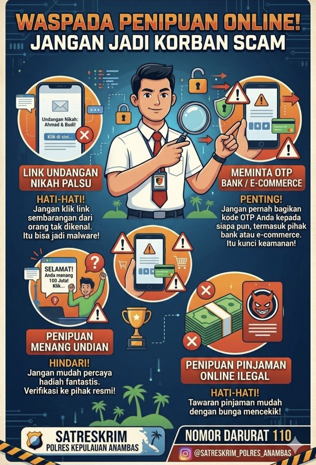 Melalui Satuan Reserse Kriminal (Satreskrim), Polres Kepulauan Anambas mengimbau masyarakat untuk meningkatkan kewaspadaan dan tidak mudah terjebak dalam praktik kejahatan digital yang semakin canggih. Imbauan tersebut disampaikan pada Rabu (1/4/2026).
